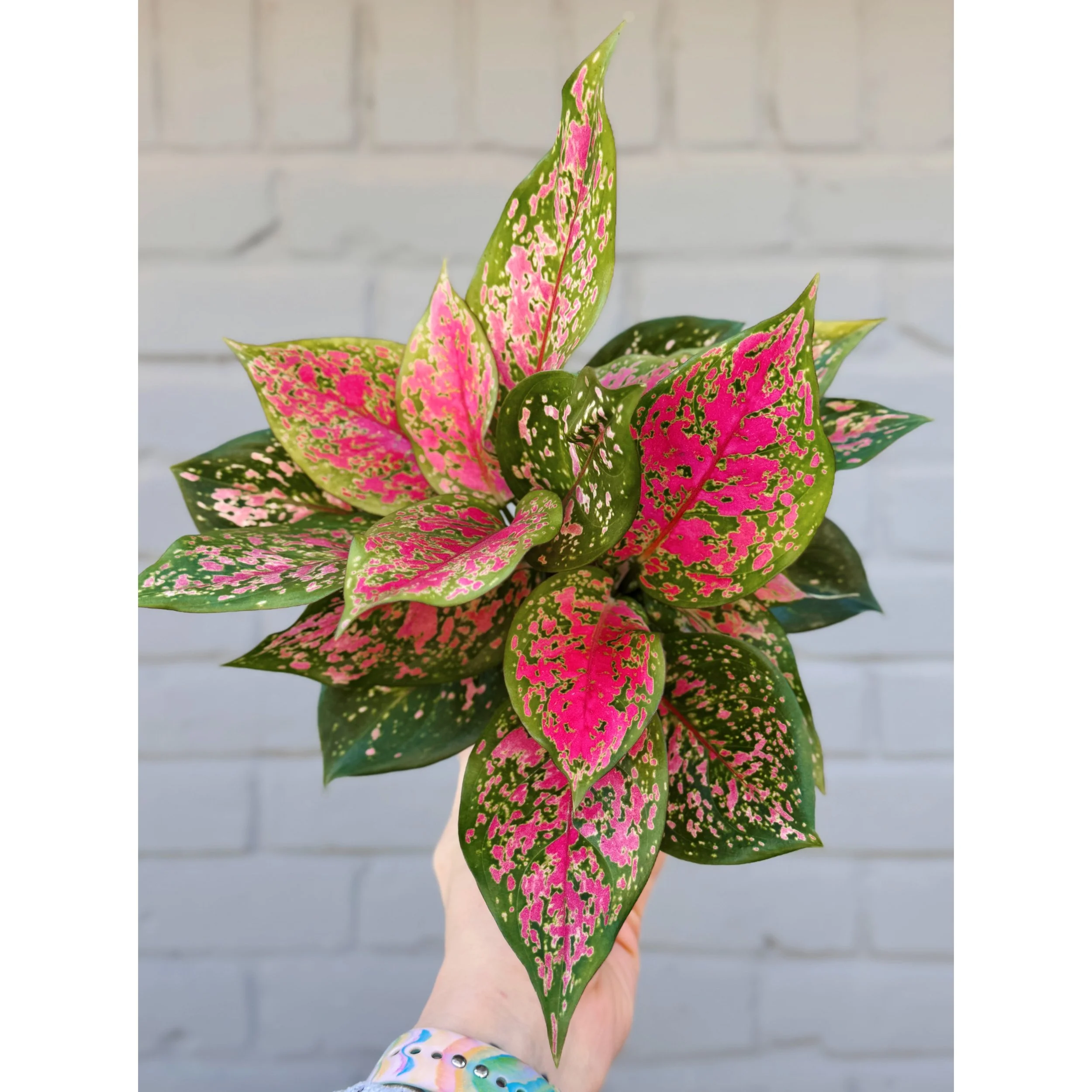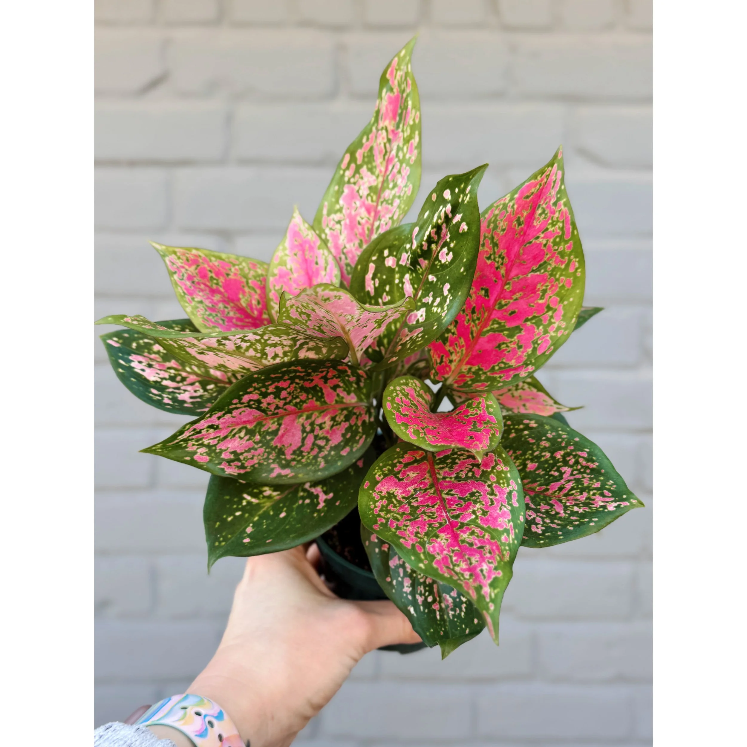 Aglaonema Pink/Red Hybrid ‘Chanel’ in a 6" nursery pot. This Chinese Evergreen features beautiful pink stems and pink, red, yellow and green patterned leaves. ‘Chanel’ is close in appearance to Two Tone Moonstone and Sparkling Sarah- like if those two varieties had a baby! This plant doubles as a mega air purifier so it is perfect for any space to add color and improve your air quality!