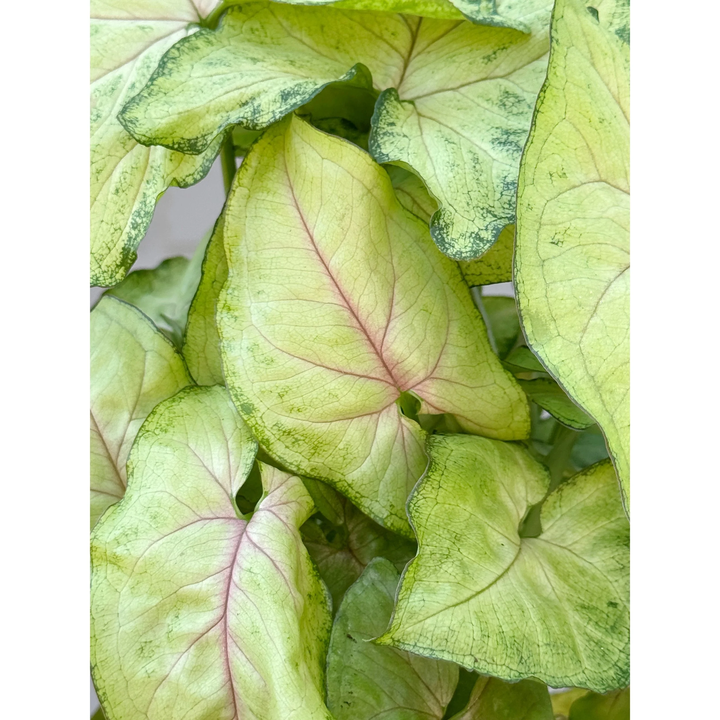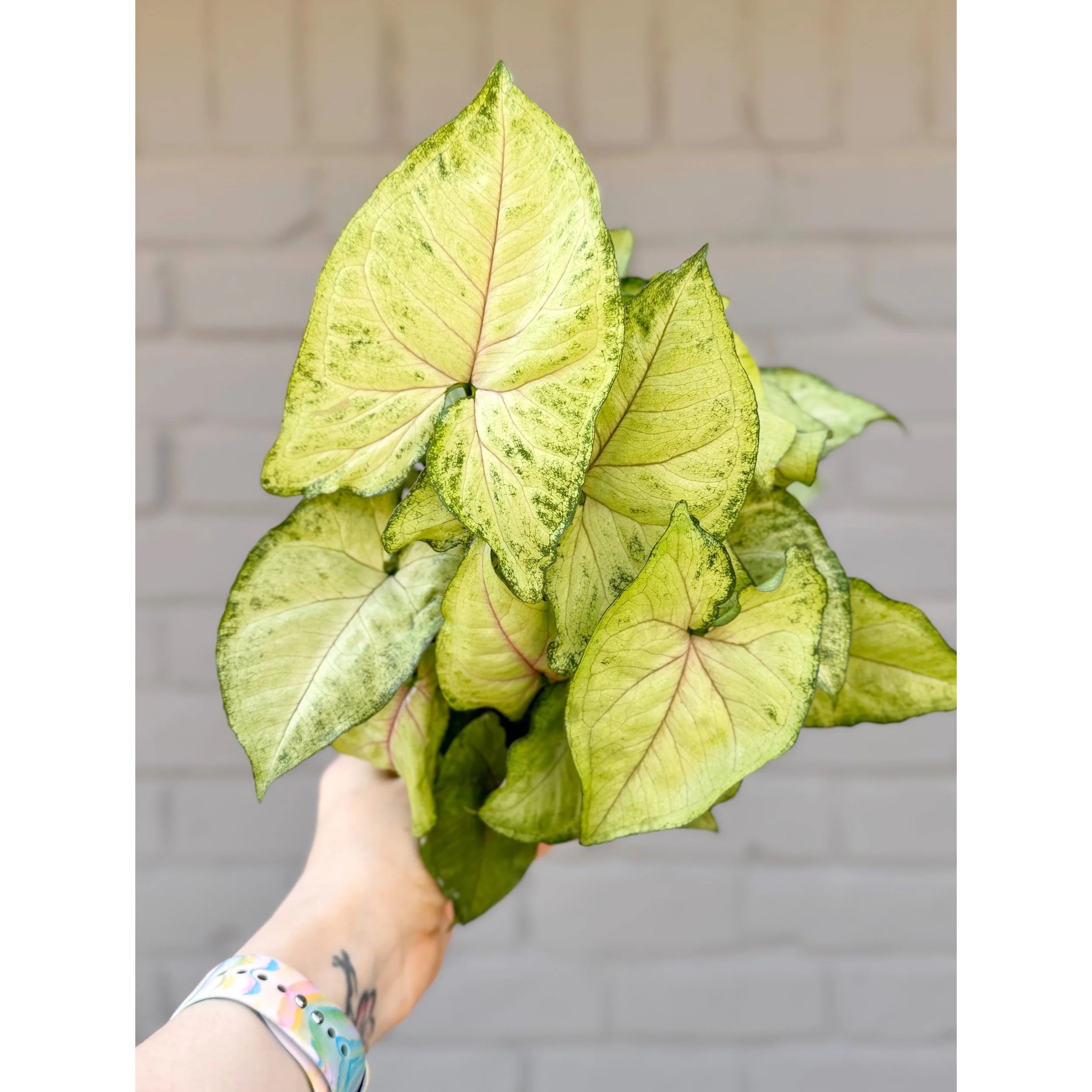 Syngonium Podophyllum ‘Milk Confetti’ in a 4” nursery pot. This playful plant boasts soft green and pastel pink splashes across arrowhead-shaped leaves, turning any room into a vibrant jungle. Super easygoing and low maintenance, it’s perfect for adding a splash of color and fun without the fuss. Whether you’re a plant newbie or a seasoned pro, Milk Confetti will brighten your space and your mood with its cheerful confetti-like charm!