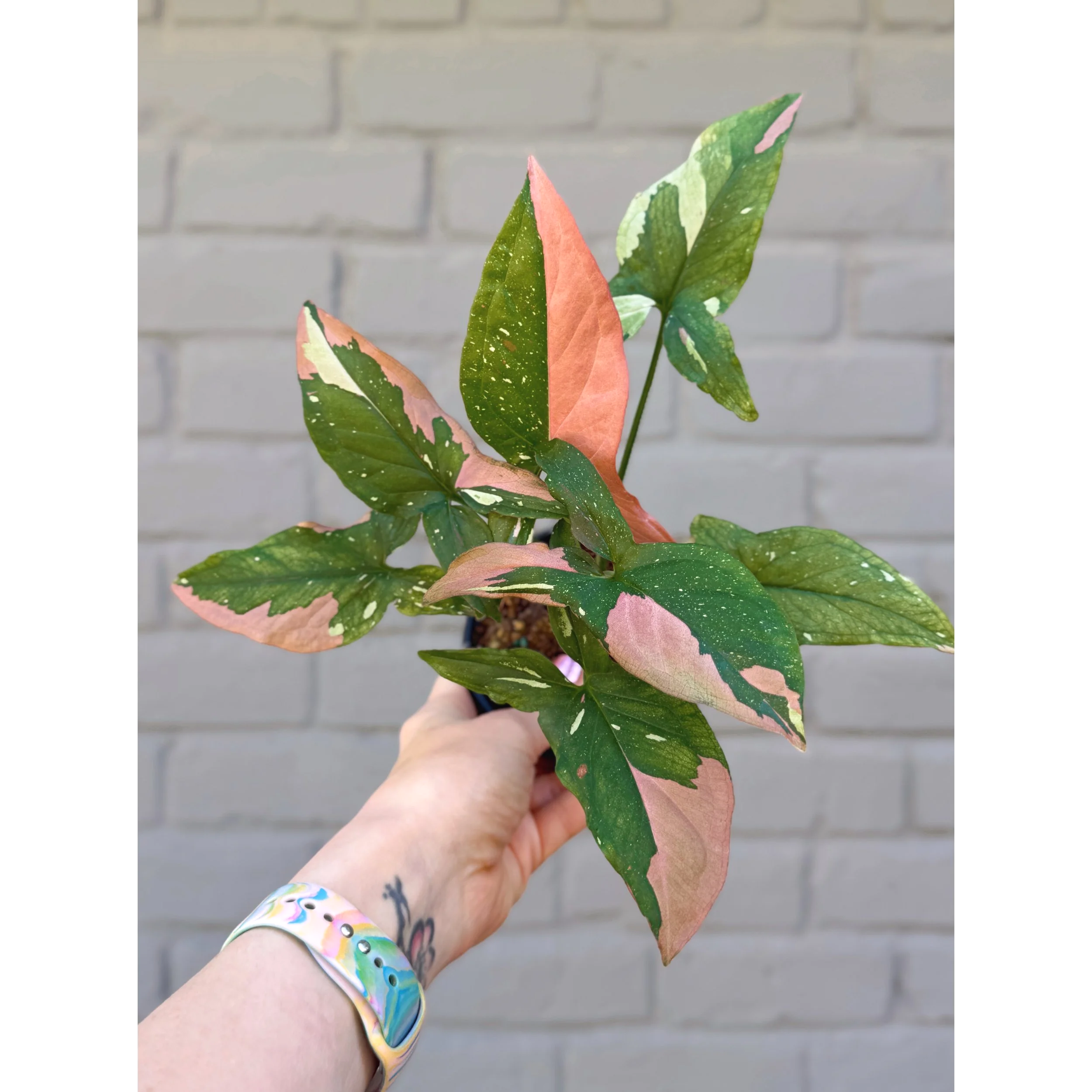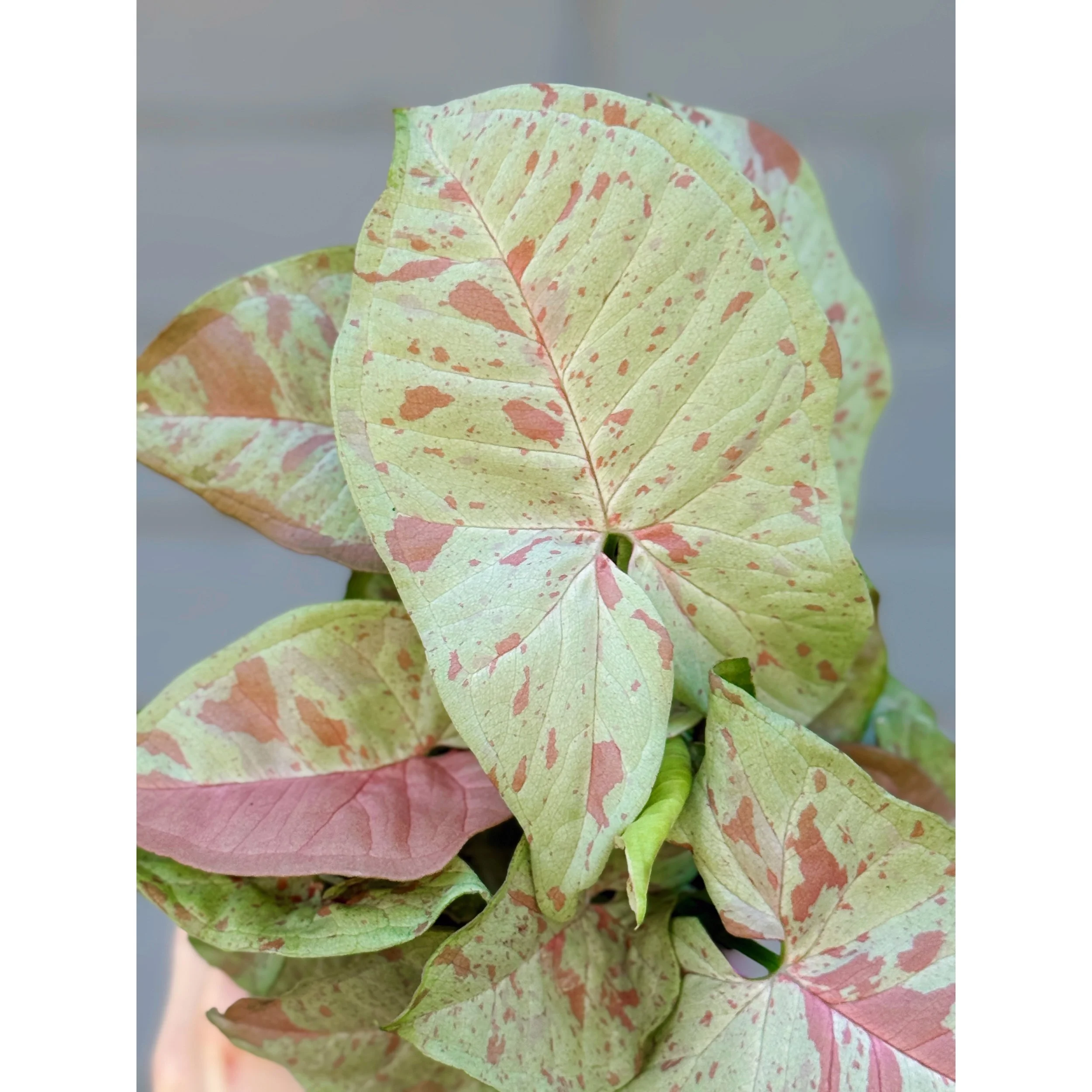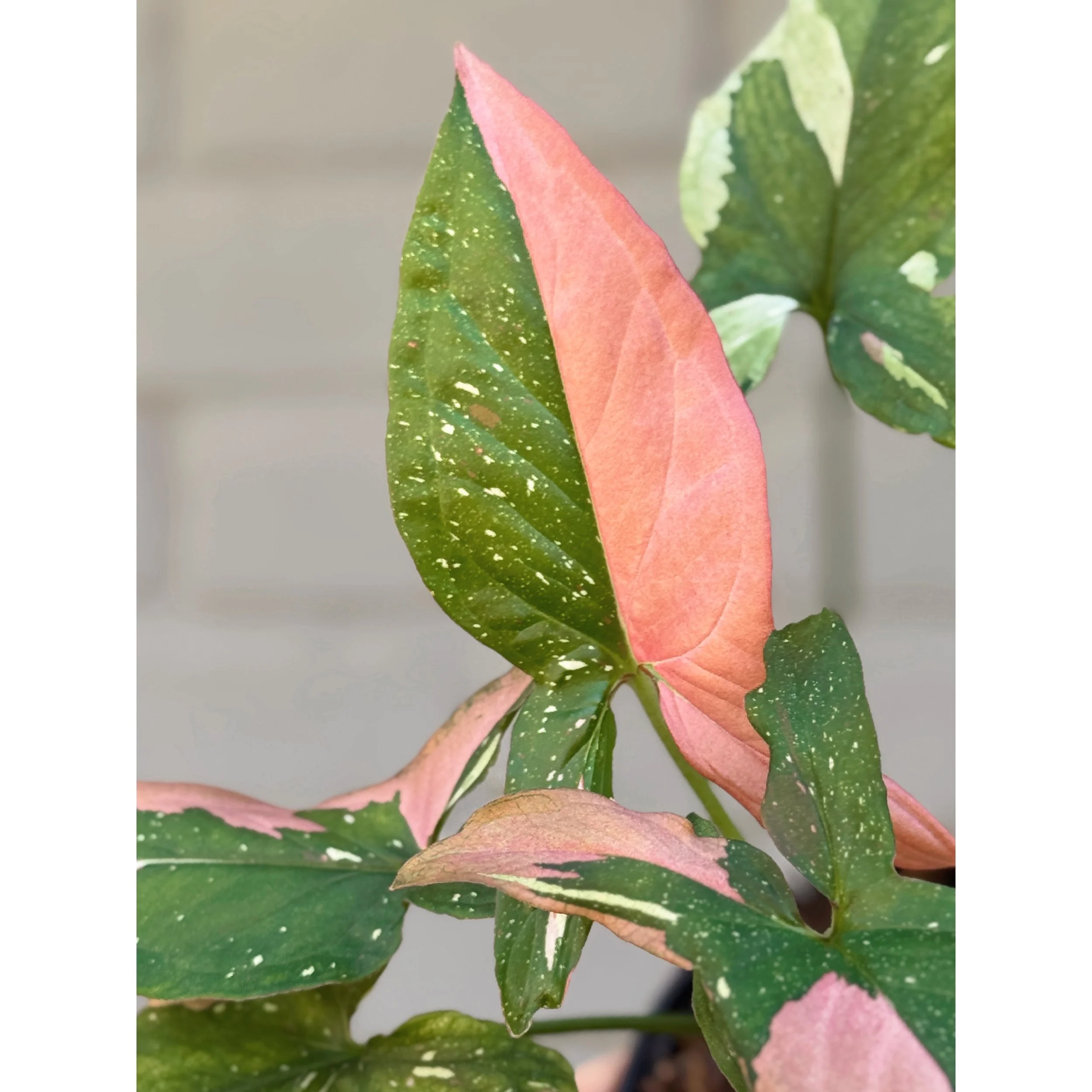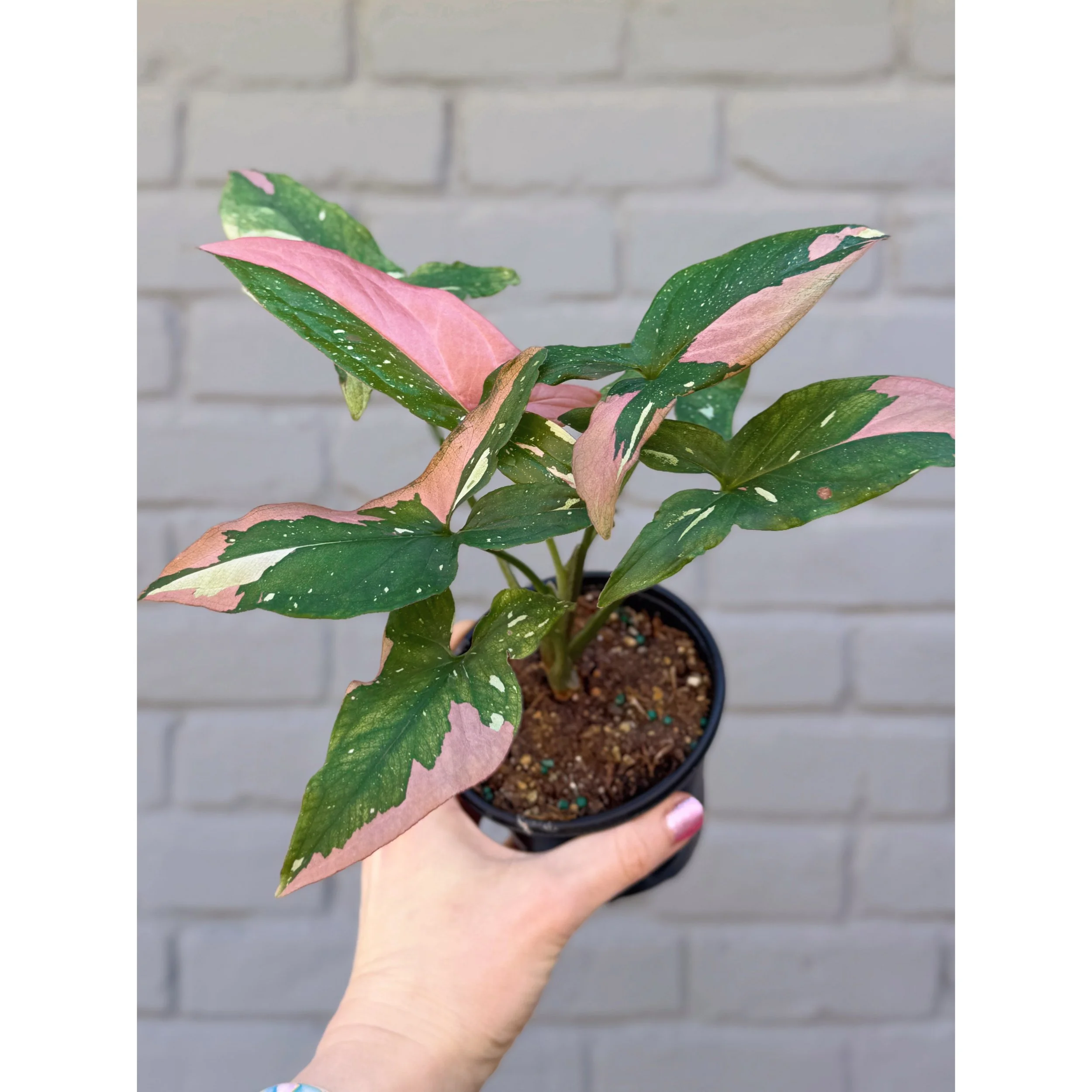 Syngonium Podophyllum 'Mickey' in a 4” plastic nursery pot. This charming aroid flaunts arrow-shaped leaves splashed with vibrant pinks and creamy greens, making it the perfect pop of color for any room. Easy to care for and super low-maintenance, 'Mickey' thrives in moderate light and adds a fun, tropical vibe to your plant collection. Bring home this cheerful charmer and watch your space come alive with joy and color!